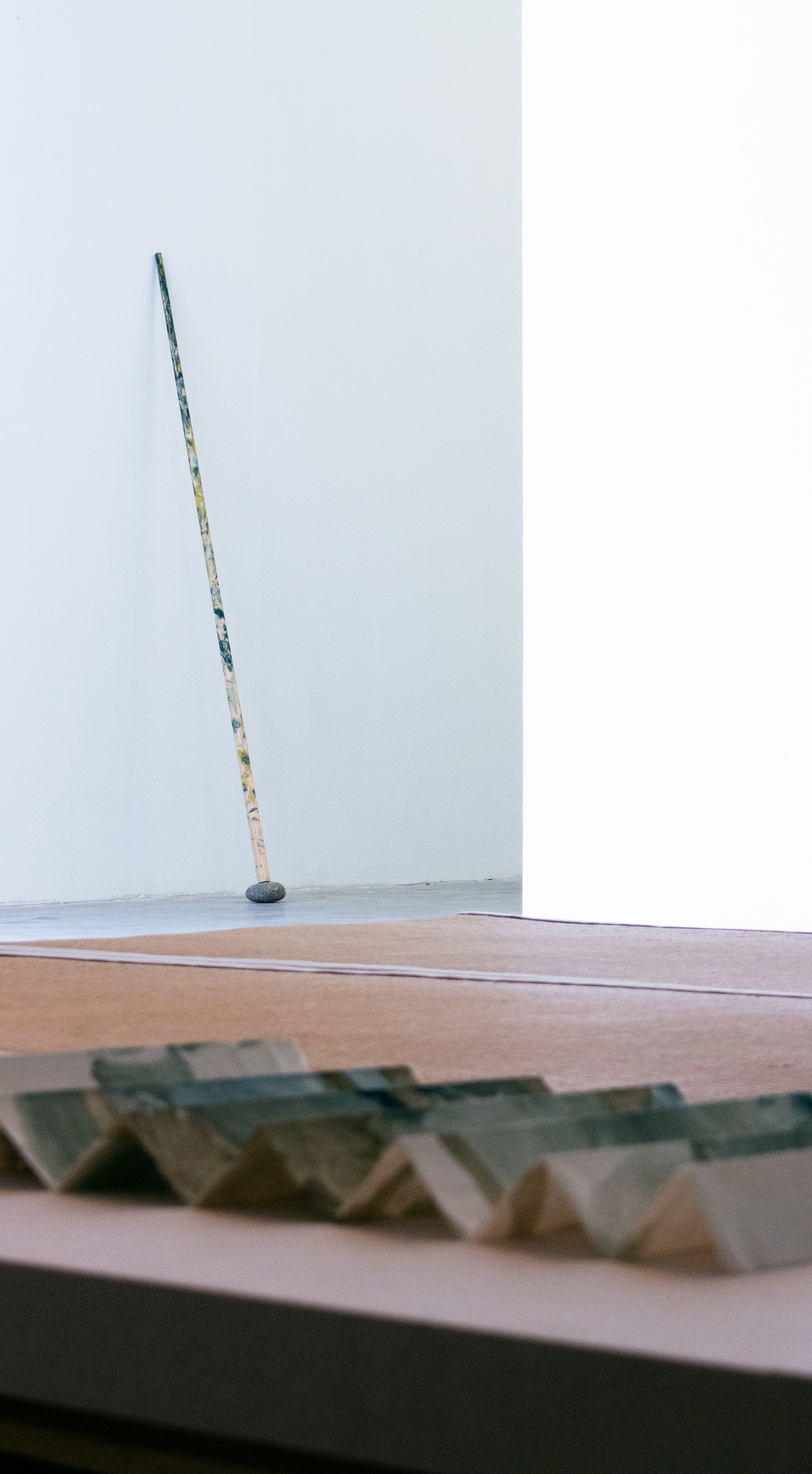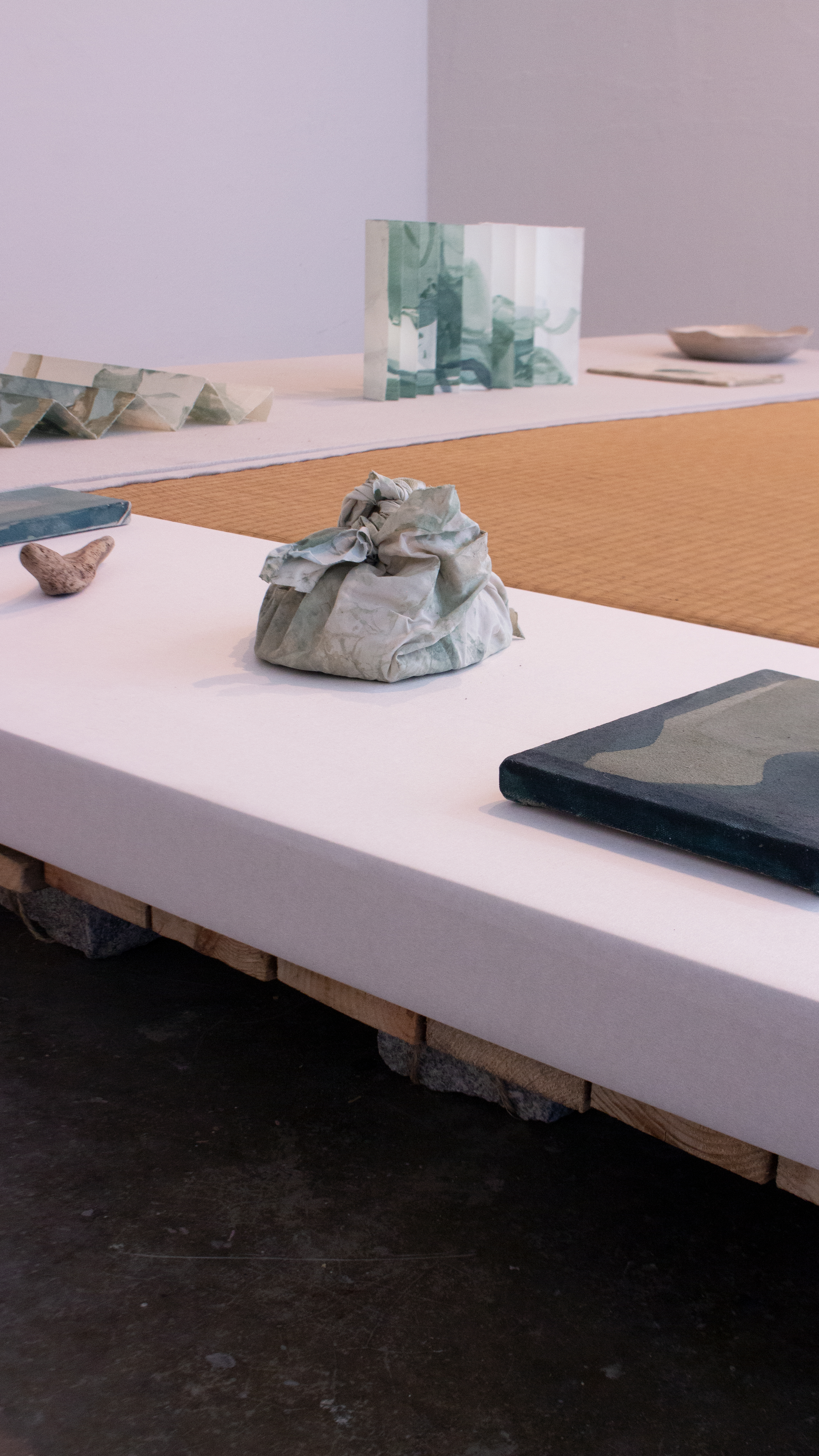 The works in this exhibition comprise a variety of paintings on paper and fabric as well as objects that Filipa collected during her trips, such as Japanese books and tatami fragments, still reverberating with the echoes of quotidian realities that they were once part of. These objects are appropriated, transformed, painted on, and intuitively arranged on the floor, walls and plinths. They act as interlocutors to the paintings, and as intermediaries, inviting the observer to ramble and wander, perhaps reflecting on the seasonal cycles of nature. Small details and intricacies carry on this dialogue: the woven surfaces, the brushwork gestures, and natural aggregates discreetly appearing within the pigments. The hues echo the wet earth, green leaves and pale mists, glow with vibrant greens and emeralds, before they sink into the earthy tones of ochre and the golden brown of tatami. A chromatic landscape that is in slow transformation itself, as its natural materials gradually age and evolve, carrying with it the murmurs and sensibilities of the mountains.