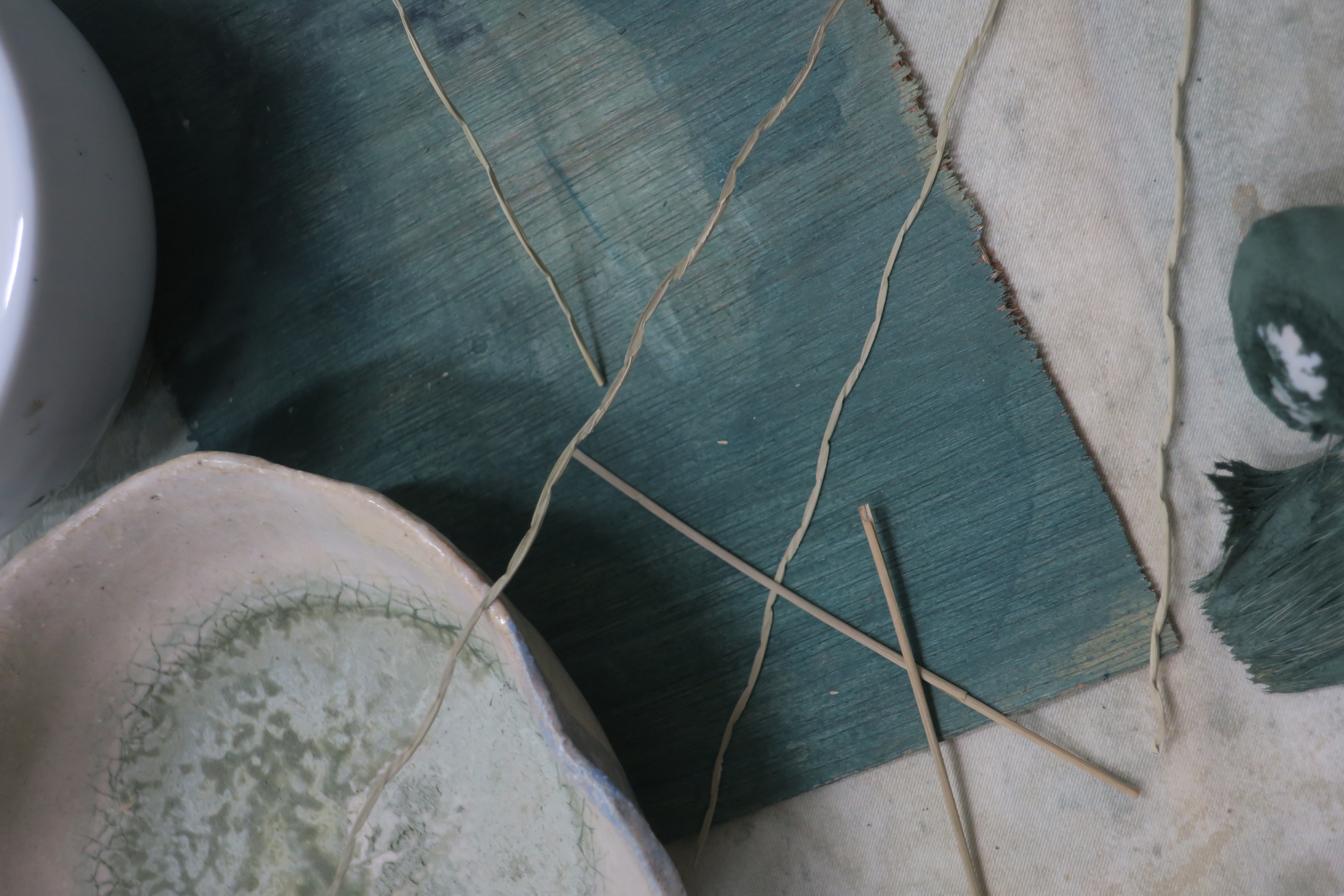 Her paintings often feature large expanses of white opaqueness, but the white does not signify emptiness: it has an atmospheric weight, like a cloud of mist, implying a different reality hidden beyond, that our imagination strives to fill. The concept of Ma (間) in Japanese philosophy states that “form is emptiness, emptiness is form”, emptiness creates space for possibility. It engages the imagination and invites the viewer to inhabit it, consciously or unconsciously — sharp mountaintops, and pine groves grazing the edge of the sea might be hiding right behind this haze; an unimaginable spectacle shaped by earth, water and wind. The rough, textured brushwork used to represent the Japanese landscape, moors us to its reality, while our eyes float away into the misty, blank space, enveloped by a soothing silence. The aim of these paintings and objets d’art is not figurative, but evocative: a means through which one can speculate about the world and stir up fading memories. Like the names of traditional Japanese hues, which try to capture fleeting moments as subtle as the sparkle of wet moss, Filipa’s works seek to convey a perpetually moving vagueness, a play of mist and light, colour and texture; the traces of her own memories.